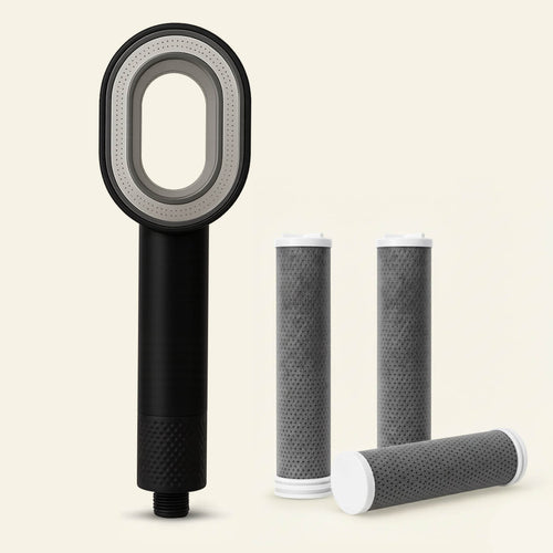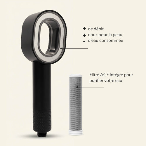 Le pommeau purifiant élimine 95 % des impuretés grâce à une technologie de filtration performante à base de charbon actif et d'acides aminés.